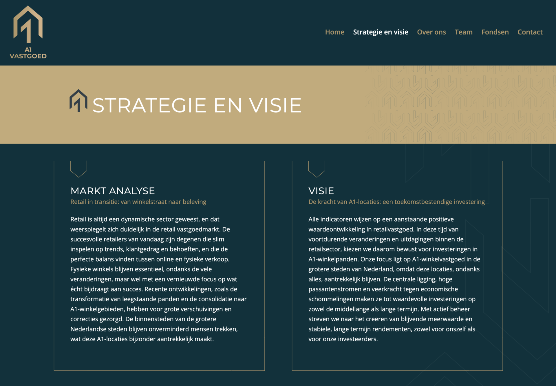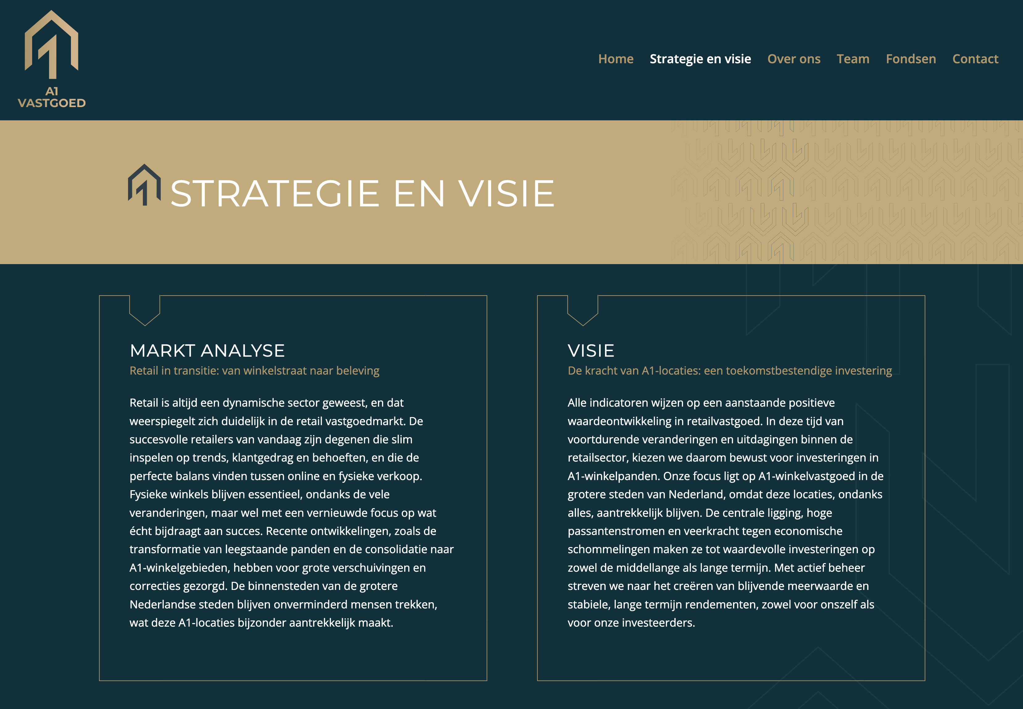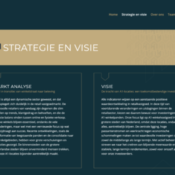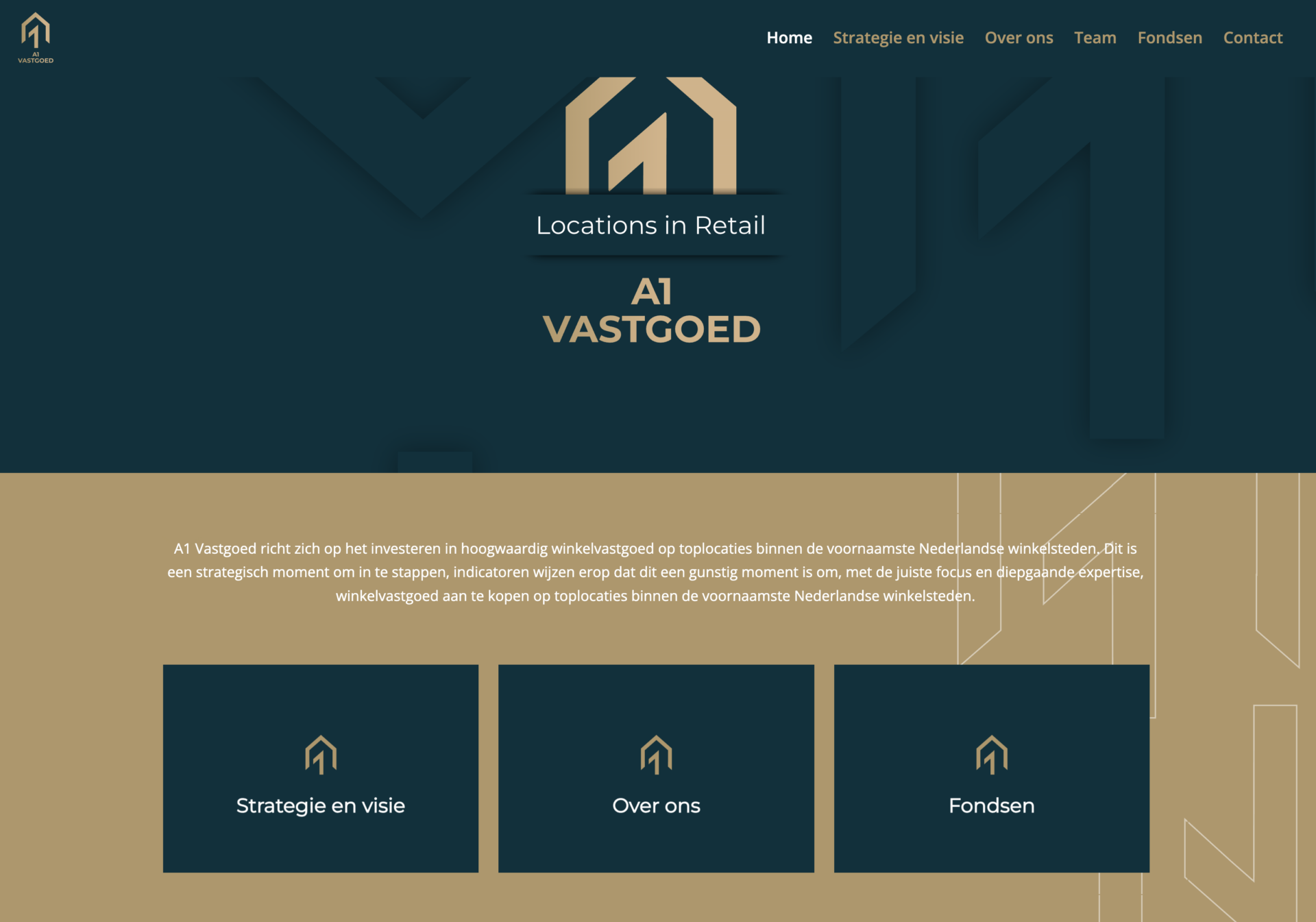 Voor A1 Vastgoed is een branding ontwikkeld van logo, huisstijl tot en met de website. Een sterke naam en vormgeving die meteen laat zien wat de core business is van deze investeringsmaatschappij. https://a1-vastgoed.nl/