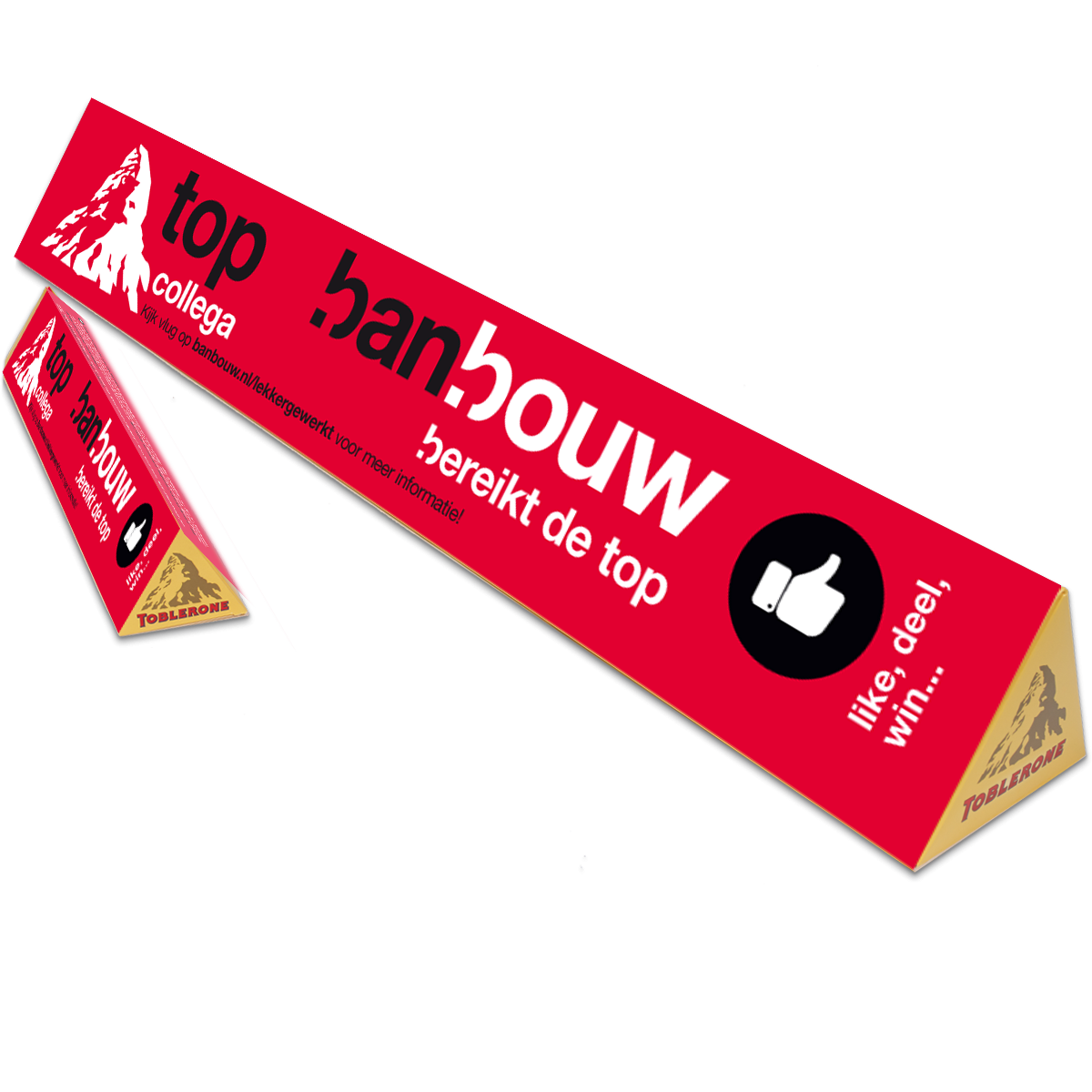 Voor de werknemers van BanBouw is een interne en externe campagne opgestart om de medewerkers en relaties te motiveren meer met social media te gaan doen. Met de Toblerone actie: top collega ‘like, deel en win’ wordt men gemobiliseerd om in het eigen netwerk social berichten te delen. De leukste berichten worden beloond met een Toblerone XXL reep van 4,5 kg. Met het thema ‘samen naar de top’, heeft cabaretier Andy Marcelissen de ‘fiets’ aftrap verricht, met zijn nieuwste personage Glen Buterol. https://banbouw.nl/samen-naar-de-top