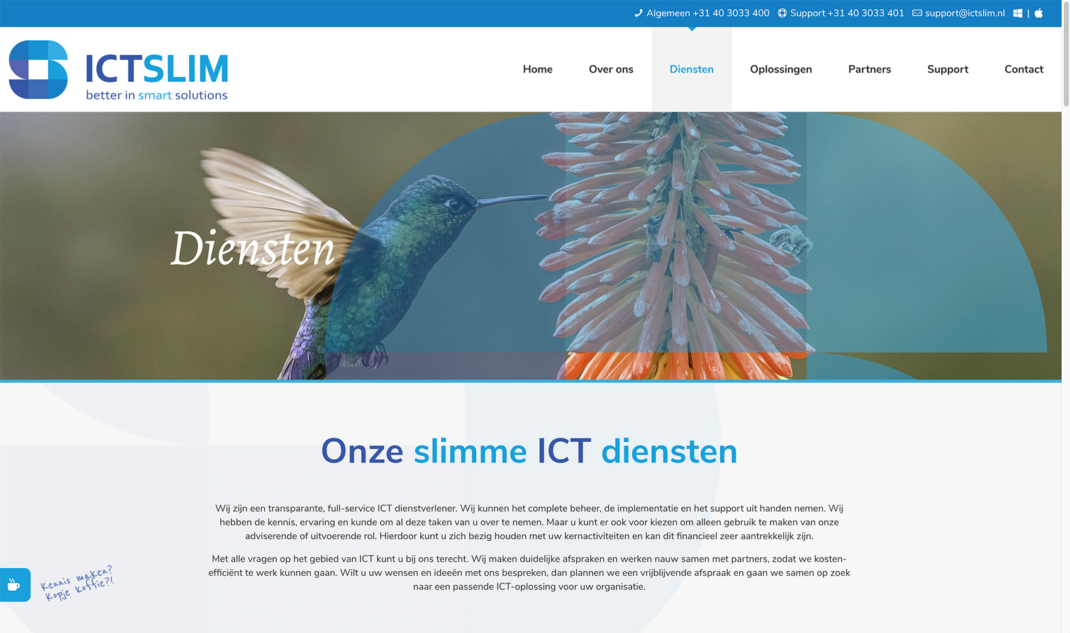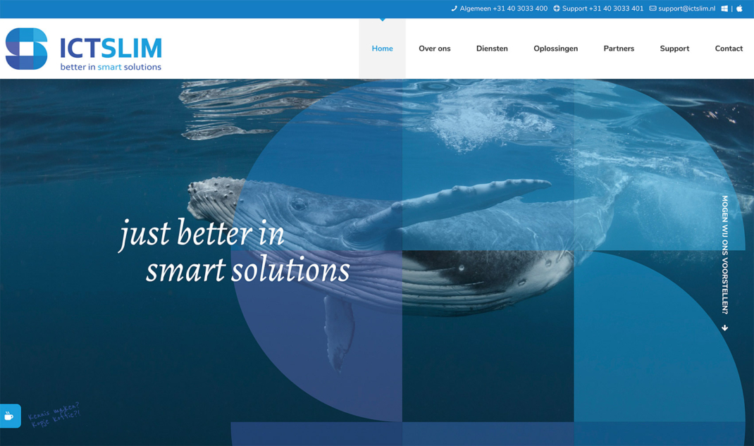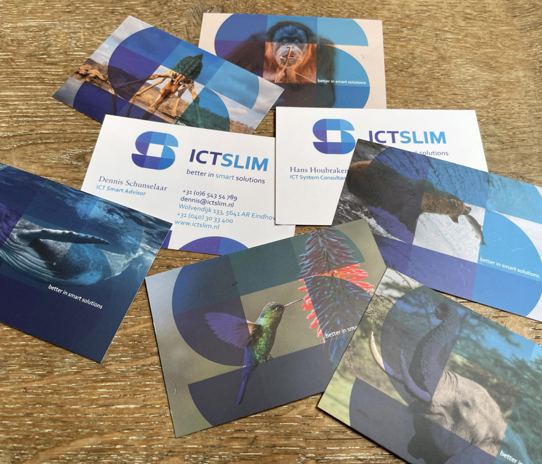ICT Slim is een nieuwe aanbieder van soft- en hardware applicaties en met een 24 uurs service dienstverlening. Hiervoor zijn een huisstijl en positionering ontwikkeld. In de vormgeving verwijst de ‘S’ naar een moderne digitale wereld in combinatie met de afbeeldingen van de dieren die symbool staan voor ‘survival of the smartest’… diegene die zich het slimste aanpast overleeft in het digitale tijdperk. ICT Slim biedt slimme oplossingen die niet altijd de duurste hoeven te zijn. Slim in advies en beheer door goede cloud oplossingen. De pay-off ondersteunt deze positionering met ‘better in smart solutions’. https://ictslim.nl/