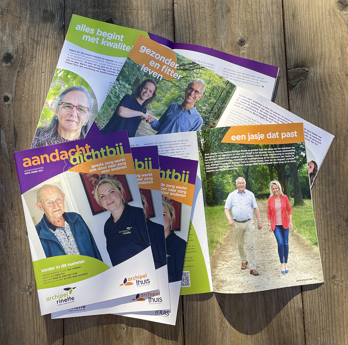 Voor de zusterorganisaties Archipel Rinette en Archipel Thuis heeft DHvV het magazine ‘Aandacht & Dichtbij’ ontworpen, met artikelen over cliënten, medewerkers en andere betrokkenen. Beide zorginstellingen zijn op zoek naar nieuwe medewerkers: Helpenden Plus, Verzorgenden IG, Verpleegkundigen en Hulp in het huishouden.
