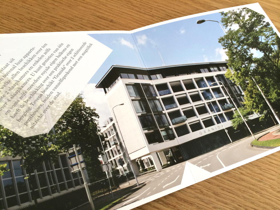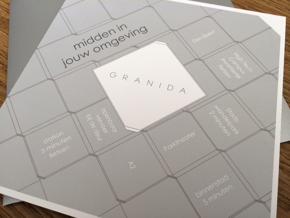 Grenzend aan de Elzent in Eindhoven ligt het fraaie complex ‘Granida’. Hiervoor werd een luxe brochure ontwikkeld om de 28 prestigieuze koopappartementen te promoten. Granida is gesitueerd op een absolute toplocatie op loopafstand van het centrum en het Parktheater.