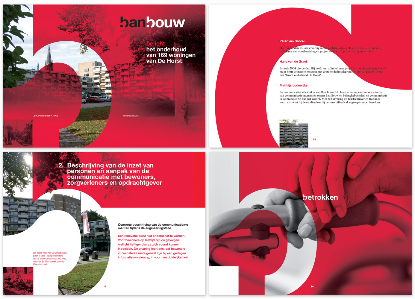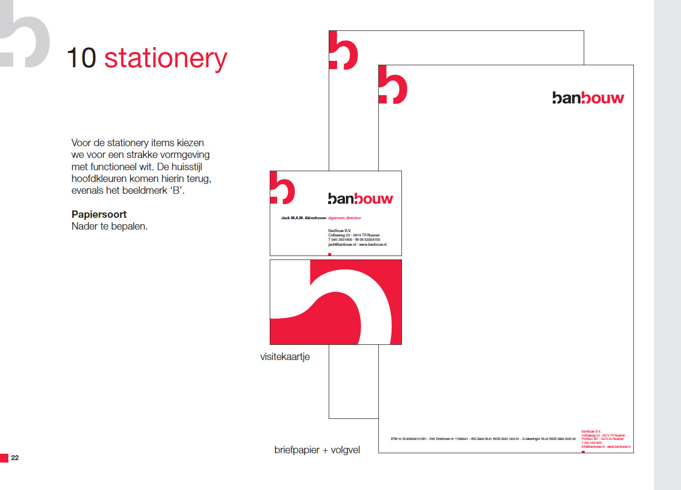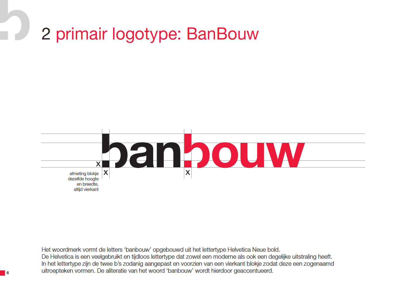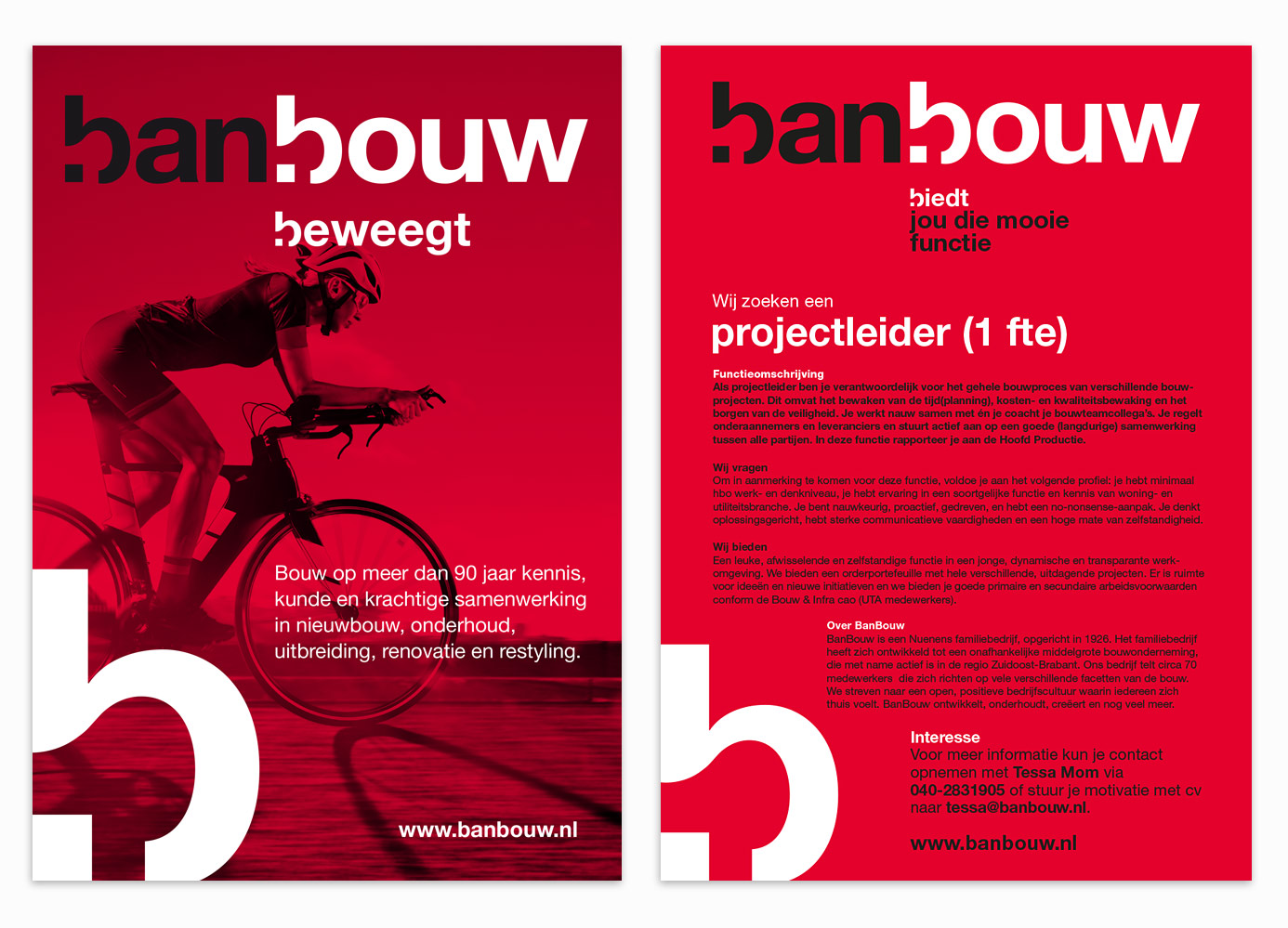 BanBouw is een innovatieve en dynamische bouwonderneming. Deze karakterkenmerken komen tot uitdrukking in de merkpositionering waarbij de kenmerkende letter B de hoofdrol speelt in een reeks afwisselende slogans: BanBouw beweegt, BanBouw berekent, BanBouw bewerkt en BanBouw bereikt.