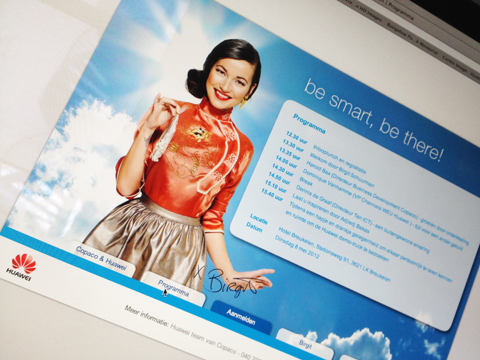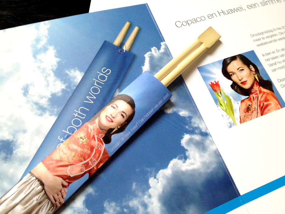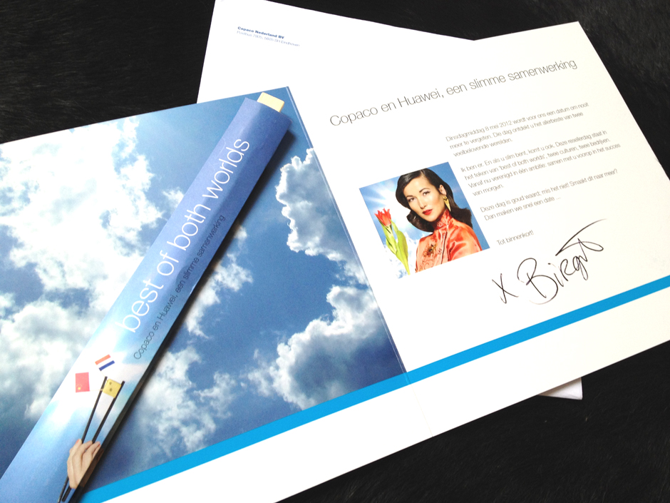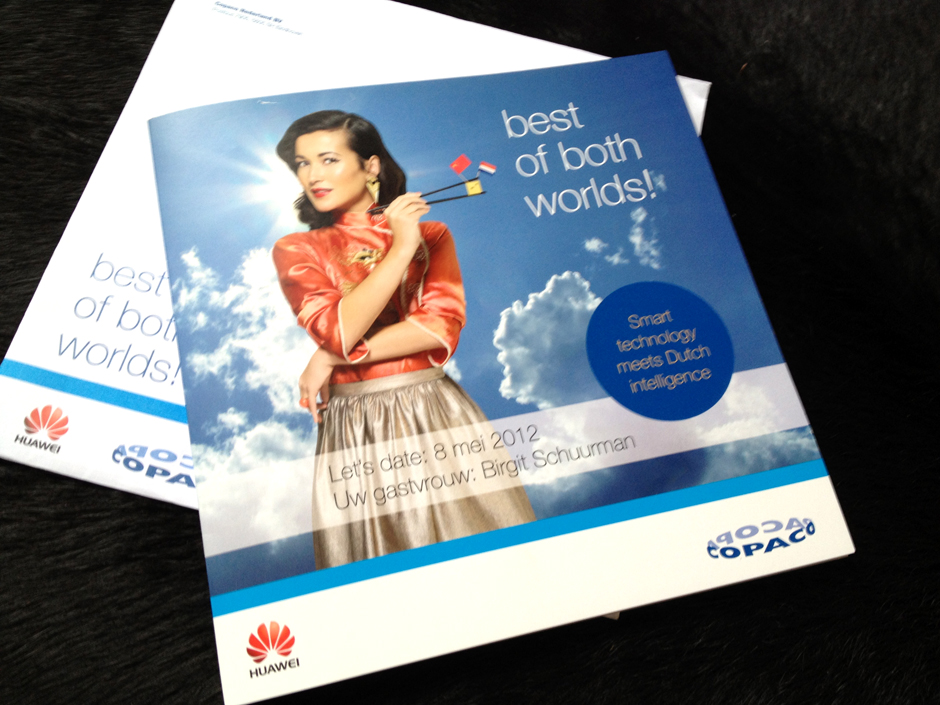 Copaco introduceert Huawei als partner op de Nederlandse markt aan haar resellers. Rondom een event dat op 8 mei 2012 plaatsvindt is een off- en online campagne ontwikkeld. Als thema voor de samenwerking van deze partijen is gekozen voor ‘best of both worlds’. ‘Chinese technology meets Dutch intelligence’ is gevisualiseerd met Birgit Schuurman als gezicht van de campagne. Met haar Chinese achtergrond zal ze tevens gastvrouw zijn op het event in Breukelen.