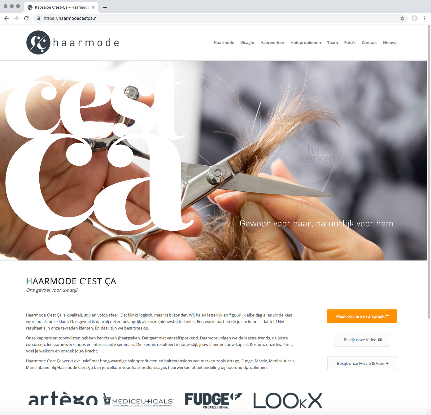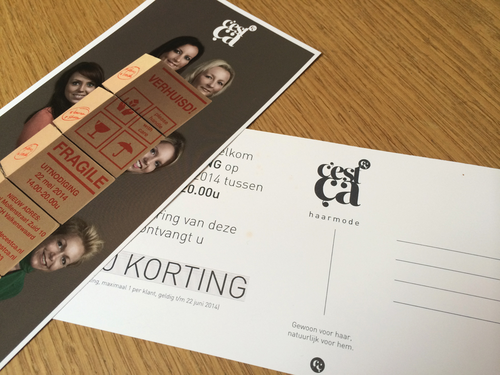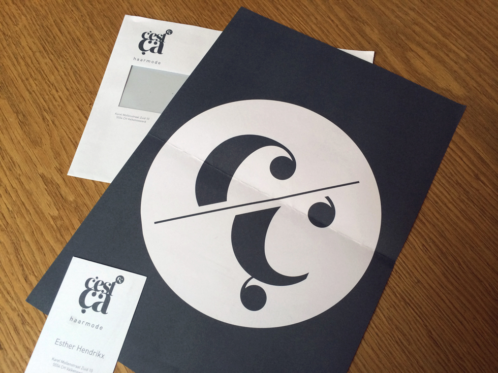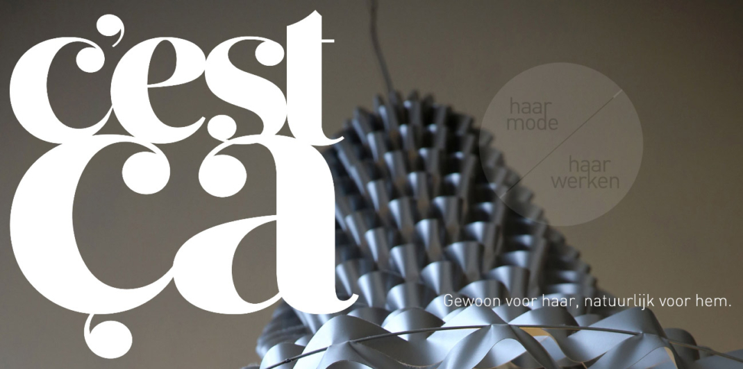 Voor C’est Ca haarmode werd een huisstijl ontwikkeld. Met de verhuizing naar de nieuwe locatie in Valkenswaard is deze huisstijl voor diverse middelen geïmplementeerd. Joep Verheijen van B-TOO heeft het interieur ontworpen van de nieuwe zaak.