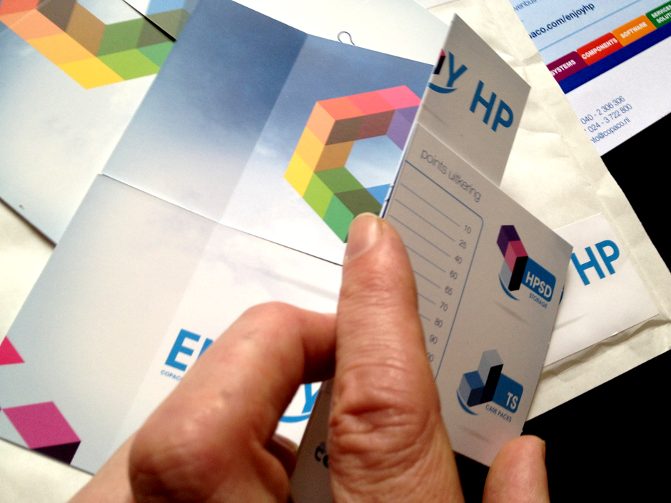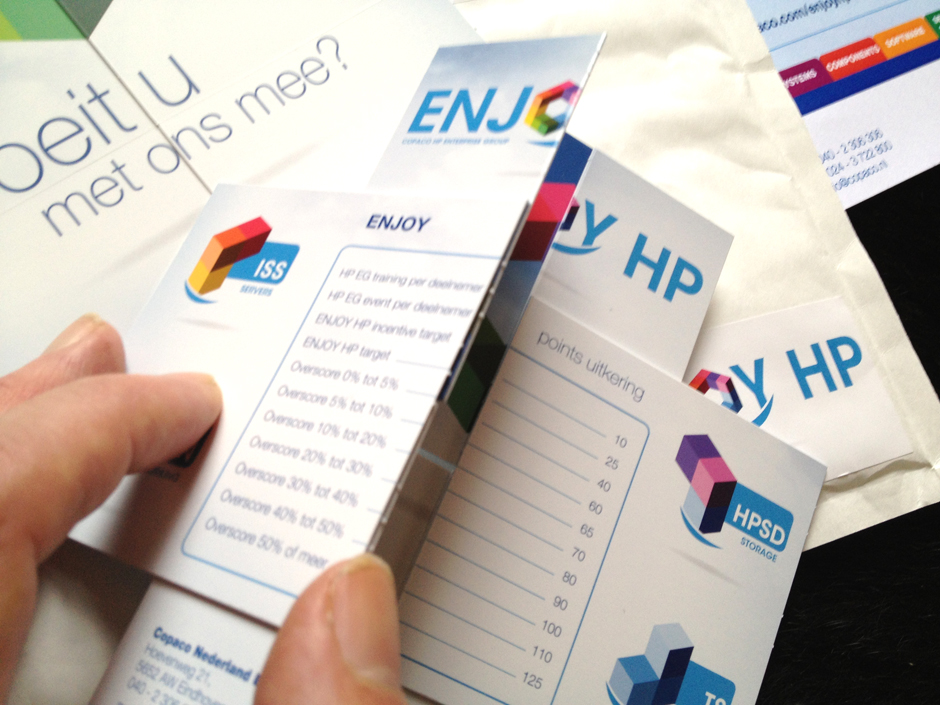 Voor Copaco werd in combinatie met HP, de Enjoy HP actie ontwikkeld. Door middel van een vouwkaart met daarin de ‘building blocks’ die refereren naar de diensten en producten die ‘modulair’ aangeboden worden, wordt uitgelegd wat Enjoy Hp te bieden heeft.