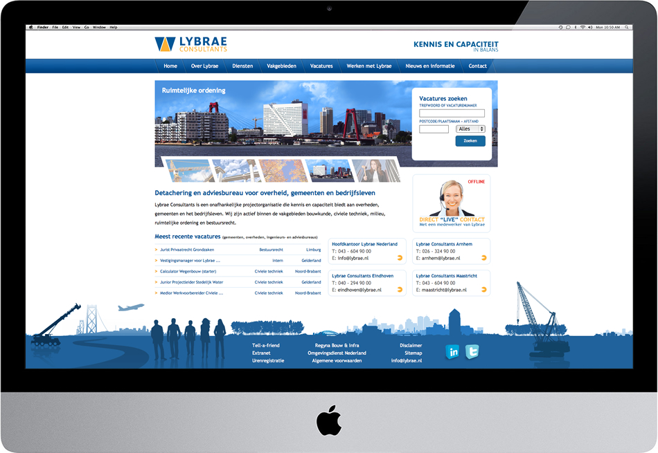 Lybrae Consultants is een detachering en adviesbureau voor overheid, gemeenten en bedrijfsleven. De website is voorzien van een vacaturesysteem, waarbij het mogelijk is voor de bezoeker om op vacatures te zoeken en te reageren. Daarnaast biedt de chatfunctie een uitkomst voor de bezoekers die direct hun vraagt beantwoord willen hebben.