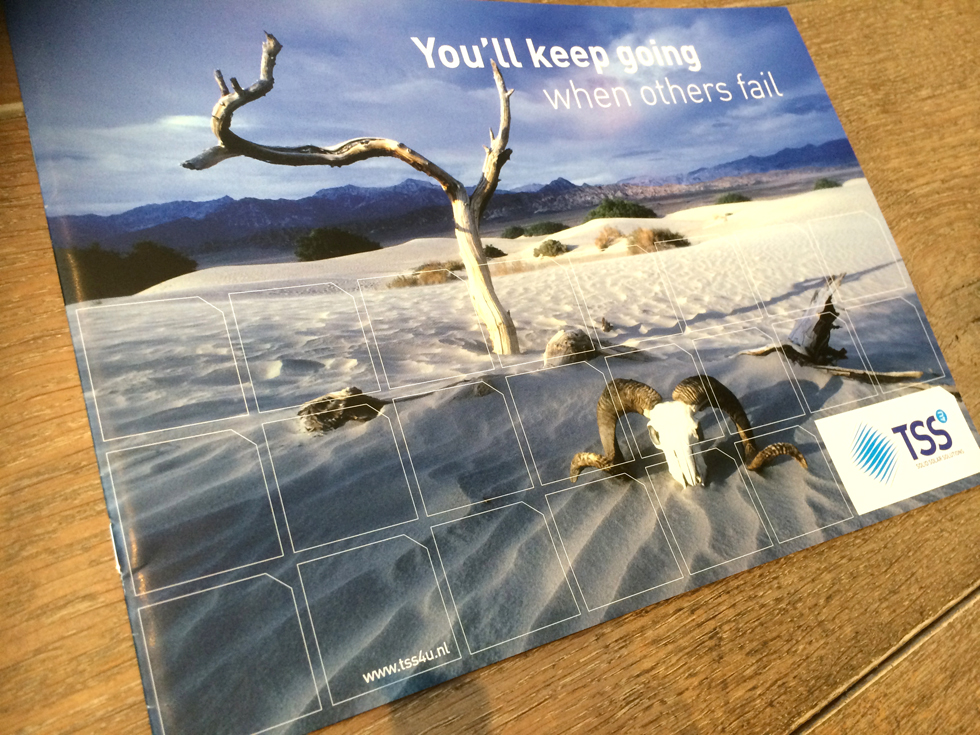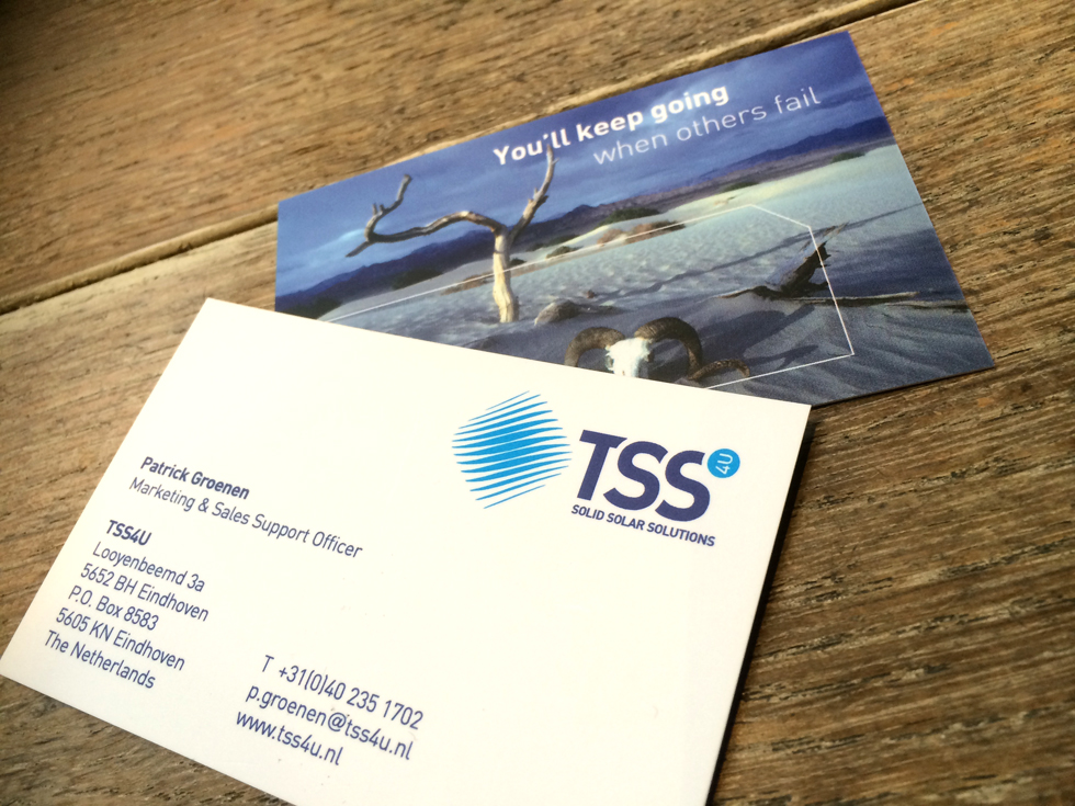 Het bedrijf TSS4U ontwikkelt ‘off-grid’ solar solutions. Deze instrumenten zijn van dusdanige kwaliteit zodat ze opgewassen zijn tegen extreme hitte of andere weersomstandigheden op uiteenlopende locaties wereldwijd. Voor TSS4U is een nieuwe merkpositionering ontwikkeld met de claim: ‘You’ll keep going when others fail’. Hierbij is een nieuw logo, nieuwe huisstijl en zijn corporate middelen ontwikkeld met de pay-off: ‘solid solar solutions’.
