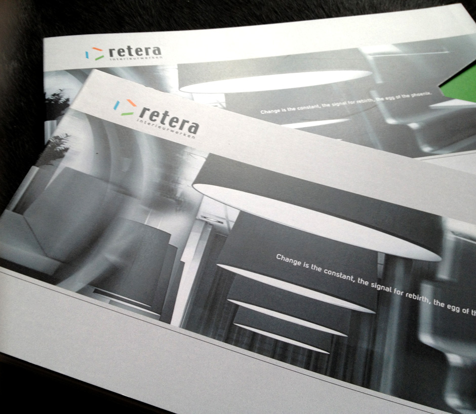 Voor Retera interieurwerken is een corporate brochure ontworpen, waarbij gerealiseerde projecten de hoofdrol spelen. Door middel van een speciaal ringbandsysteem is iedere brochure naar behoefte uniek te maken om zodoende een specifieke opdrachtgever of branche te bereiken.