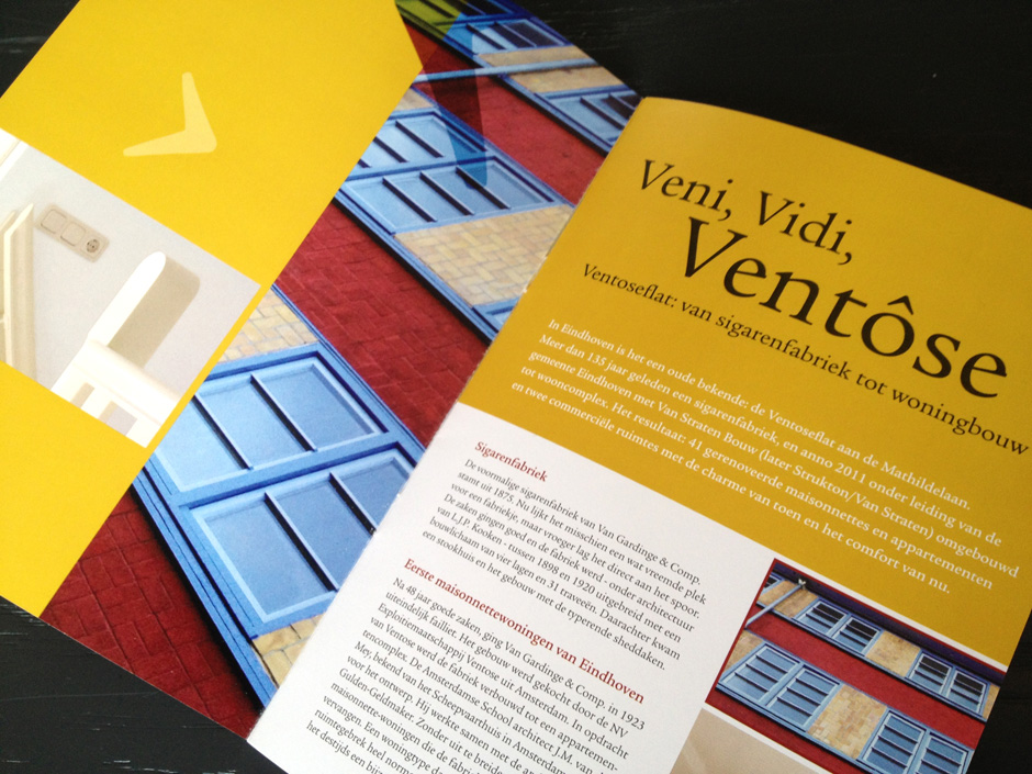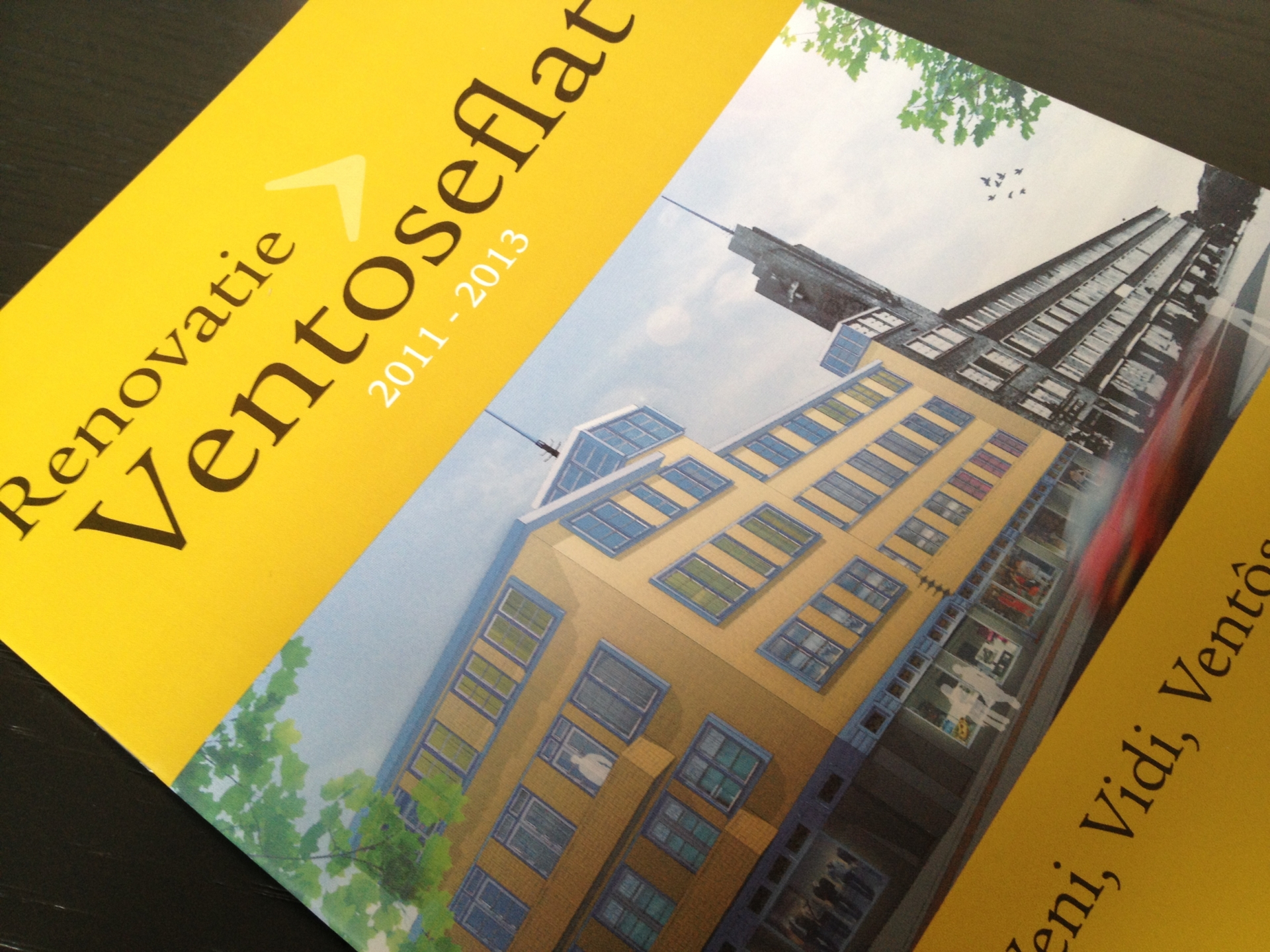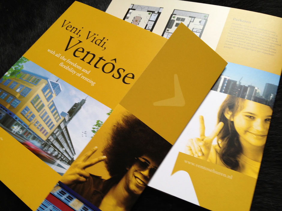 De eerste uiting voor de promotie ten behoeve van huurwoningen in de gerenoveerde Ventôse flat: Veni, Vidi, Ventôse ‘met alle vrijheid van huren’.
