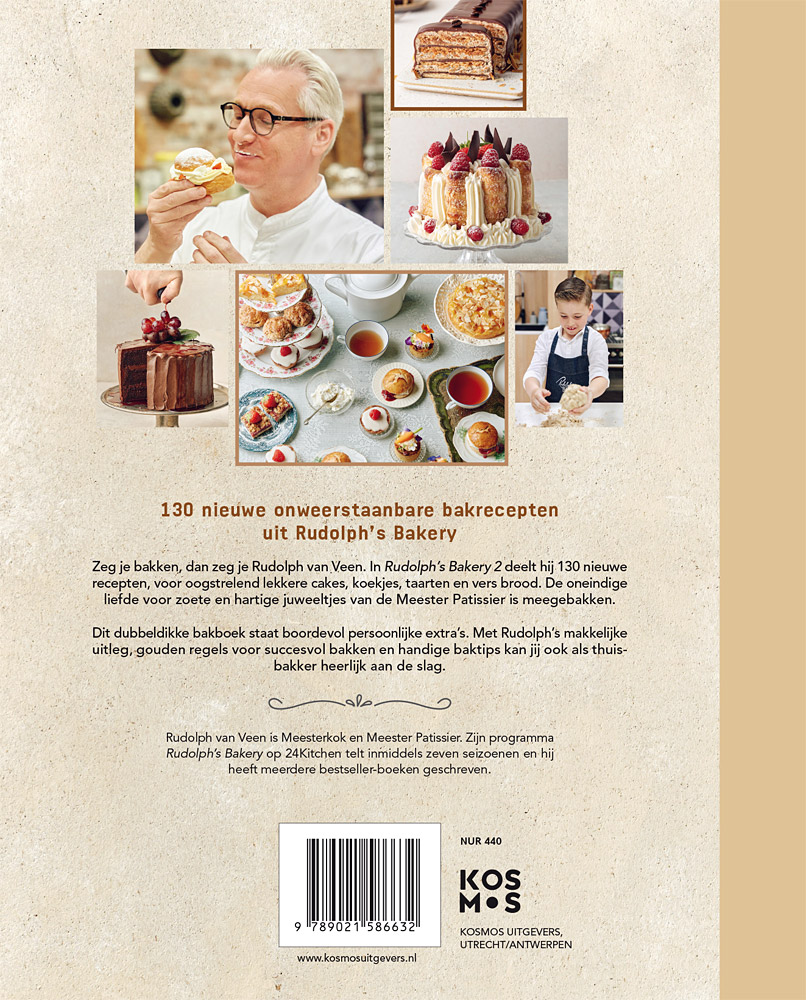 Zeg je bakken, dan zeg je Rudolph van Veen. De Meester Patissier, bekend van onder andere tv-zender 24Kitchen, weet als geen ander hoe je oogstrelend lekker cakes, koekjes, taart en vers brood maakt. In ‘Rudolph’s Bakery 2’ deelt hij 130 nieuwe bakcreaties. Het wordt alweer het tiende boek van Rudolph dat wordt vormgegeven door De Heeren van Vonder en verschijnt in oktober 2021 in de boekhandel.