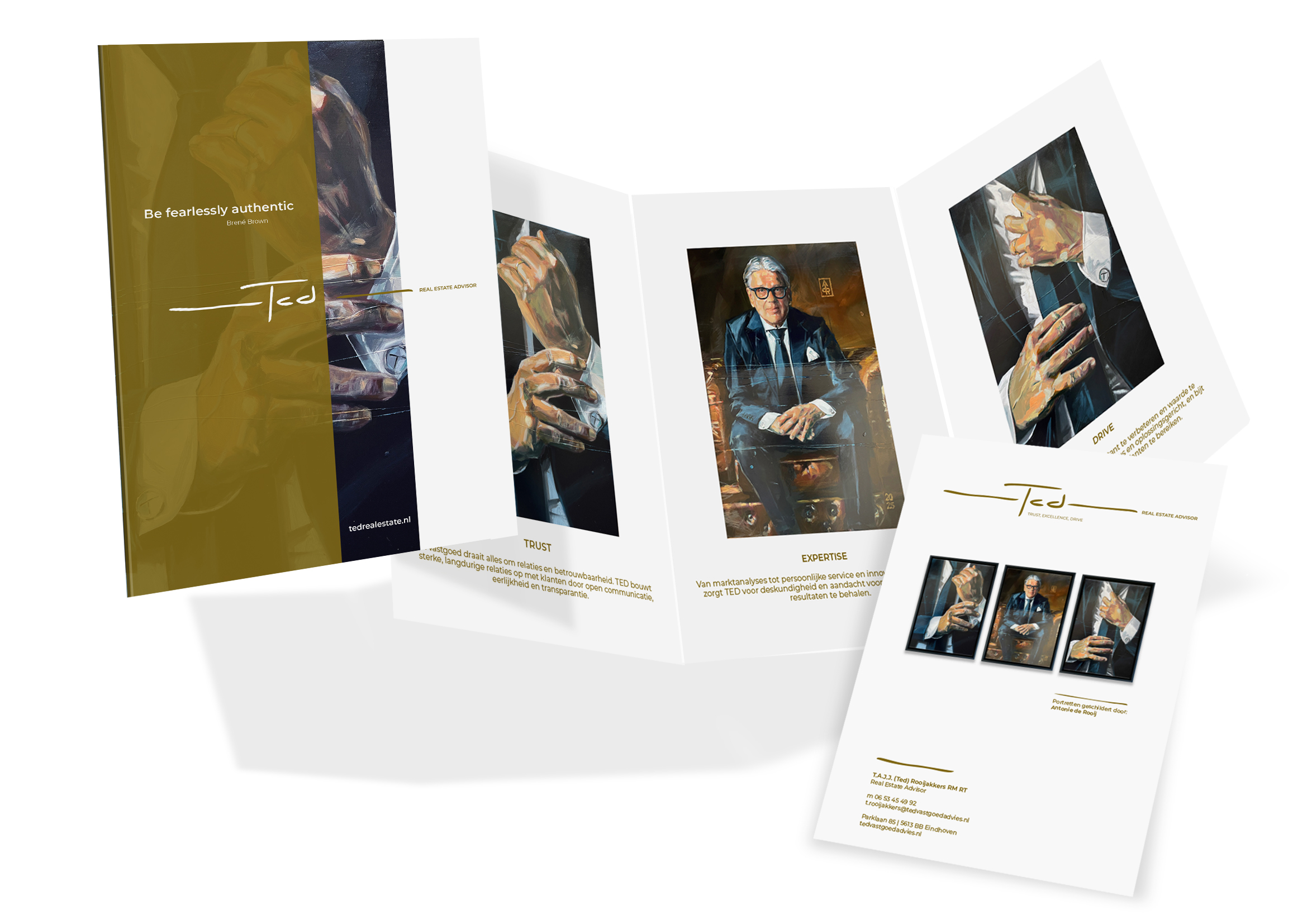 Voor Ted Rooijkakkers is er een nieuwe branding ontwikkeld met de huisstijl TED. Dit is uitgewerkt in diverse online en offline middelen. De drager van de positionering bestaat uit een portret 3-luik geschilderd door Antonie de Rooij. De belangrijkste kernwaarden zijn hierbij in beeld gebracht: Trust, Excellence en Drive. https://tedrealestate.nl
