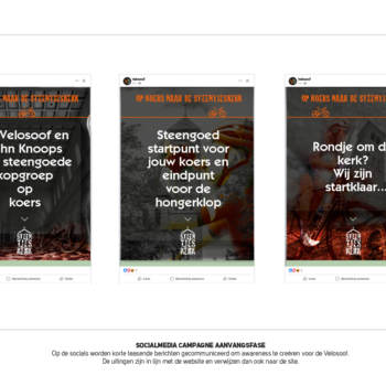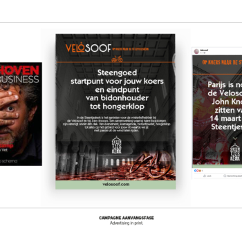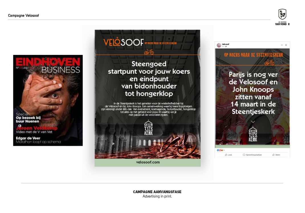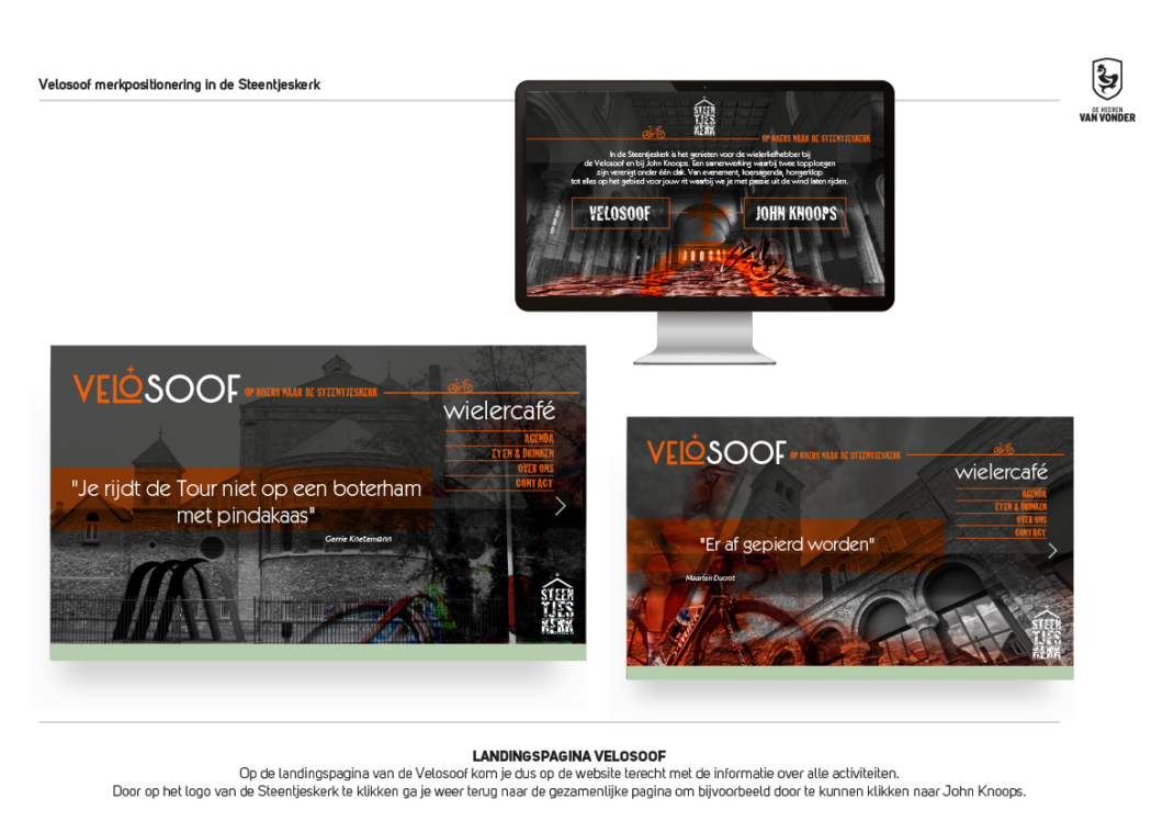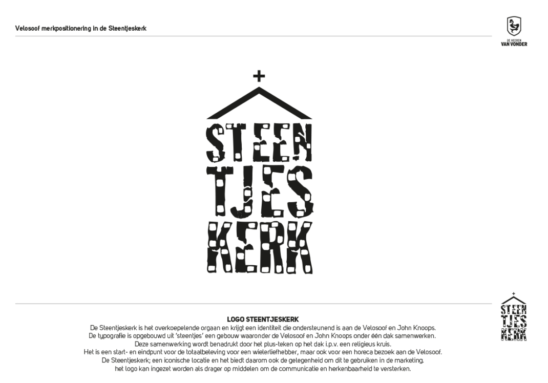Het wielercafé Velosoof is te vinden samen met John Knoops in de Steentjeskerk in Eindhoven. Met de prachtige wielerzaak van John Knoops, voorzien van topmerken en de horeca en wielerevenementen van Velosoof is dit een sterke combinatie en een nieuw concept in de stad. De Steentjeskerk is een bijzonder mooi gebouw en verdient het dan ook om genoemd te worden in de positionering en branding. Voor Velosoof heeft DHvV de complete positionering, branding en implementatie ontwikkeld. www.velosoof.com